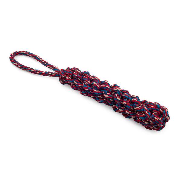 This earth-friendly dog toy is made from recycled t-shirts that would otherwise go into landfill. By purchasing this product, you are helping us to turn 'waste' fabric into fun toys for dogs and reducing their carbon paw-print! The toy can be washed at 30° with dark items and can be placed in the textiles recycling bin when you have finished with it. Please note that this toy has been designed for tugging and retrieval and is not indestructible. Supervision is advised while your dog plays with this item, as it measures 52cmx6cm.