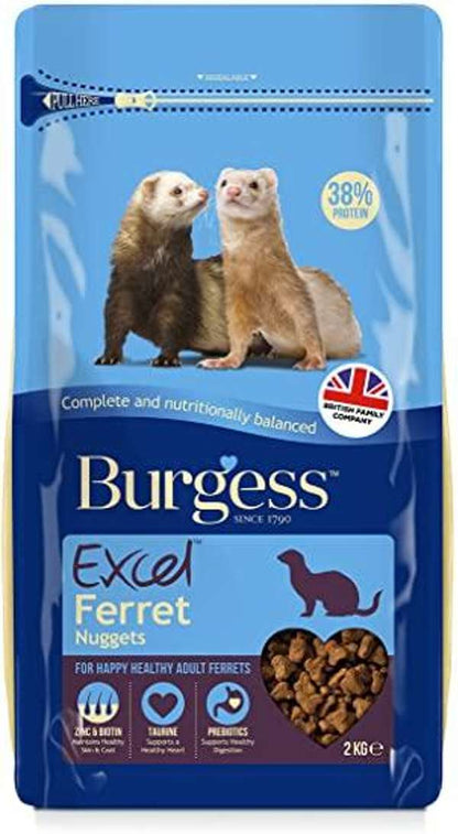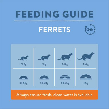 Burgess Ferret Nuggets are a complete and balanced diet made from high quality ingredients, specially formulated to meet the needs of obligate carnivores. Our recipe contains a high level of protein from quality chicken, as well as essential nutrients, fat, and prebiotics for healthy digestion. Our nuggets are fortified with vitamins A, D3, and E for healthy skin, coat, teeth, and bones, and contain taurine for coat condition and overall health. Plus, our product is convenient and easy to feed, and there is no risk of attracting flies as can happen with fresh meat. Introduce Burgess Ferret Nuggets to your ferret gradually, mixing in the new food with the old over a period of 7-10 days until the new food completely replaces the old diet. Be sure to provide your ferret with fresh, clean water at all times.