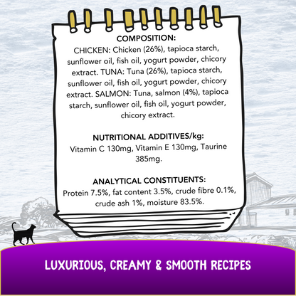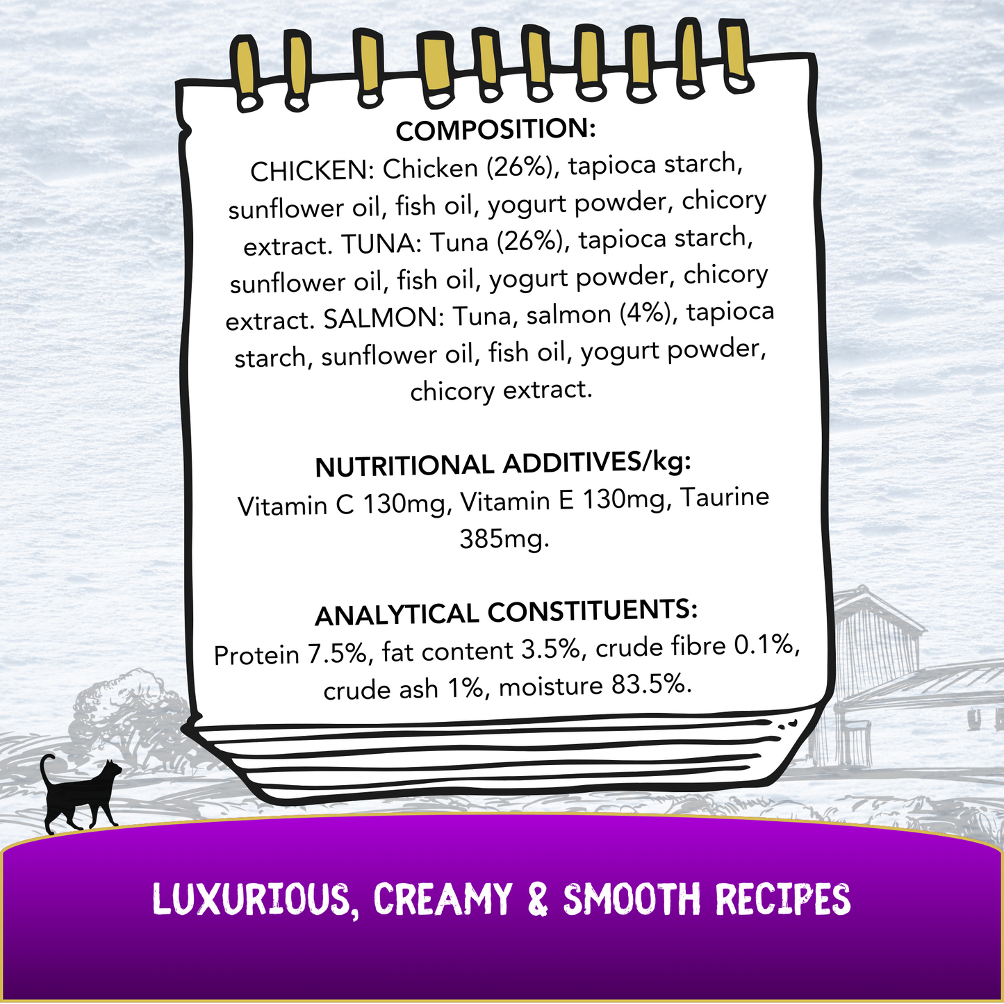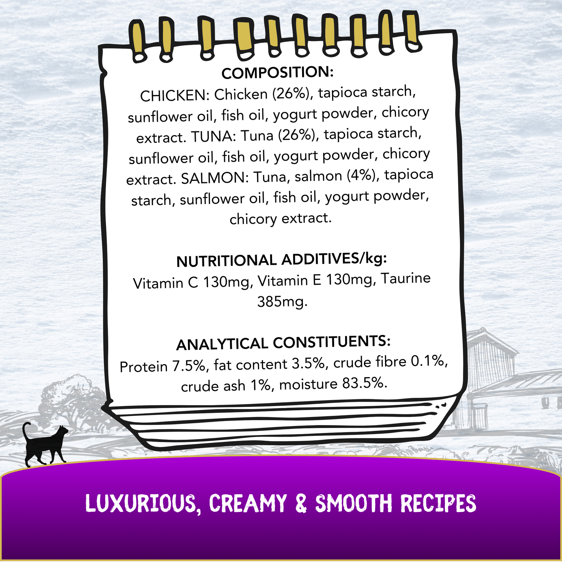 We believe that our cats deserve the very finest treats available, which is why we made the Luxury-Licks range. Carefully crafted and prepared by hand with care, Luxury-Licks Mixed Variety are naturally grain & gluten free, contain zero artificial preservatives or colours and contain the perfect blend of taurine & vitamins C & D, meaning they're healthy as well as being delicious.
