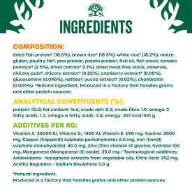 James Wellbeloved Cat Food Fish & Rice Senior contains carefully selected natural ingredients that proactively support your pet's health. This hypoallergenic recipe excludes common allergens like beef, pork, soya, eggs, dairy, and wheat. With taurine for a healthy heart, natural prebiotics and fibres for digestion, and omega 6 and zinc for skin and coat health, this food also contains vitamin E and minerals to boost the immune system of your mature cat.