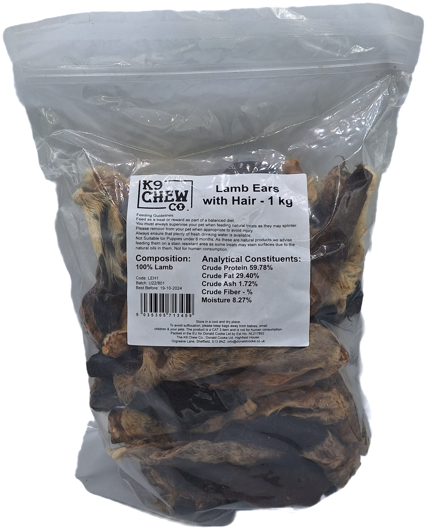 Indulge your furry companion with K9 Chew Co.'s gourmet Lamb Ears with Hair. Sensitive stomachs will rejoice with this healthy, air-dried alternative to pigs ears. Treat your pup to a rich, flavorful chew that promotes healthy nutrition and satisfies their natural urge to chew. Available in a 1kg package.
