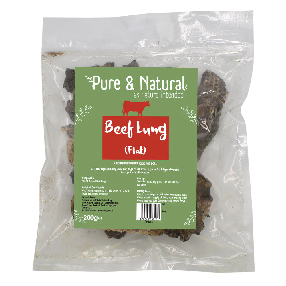 The mouth-shaped size and superb crispy texture of the Pure and Natural Beef Lung Flat make them a great all-time snack for all dog breeds, including puppies and seniors.