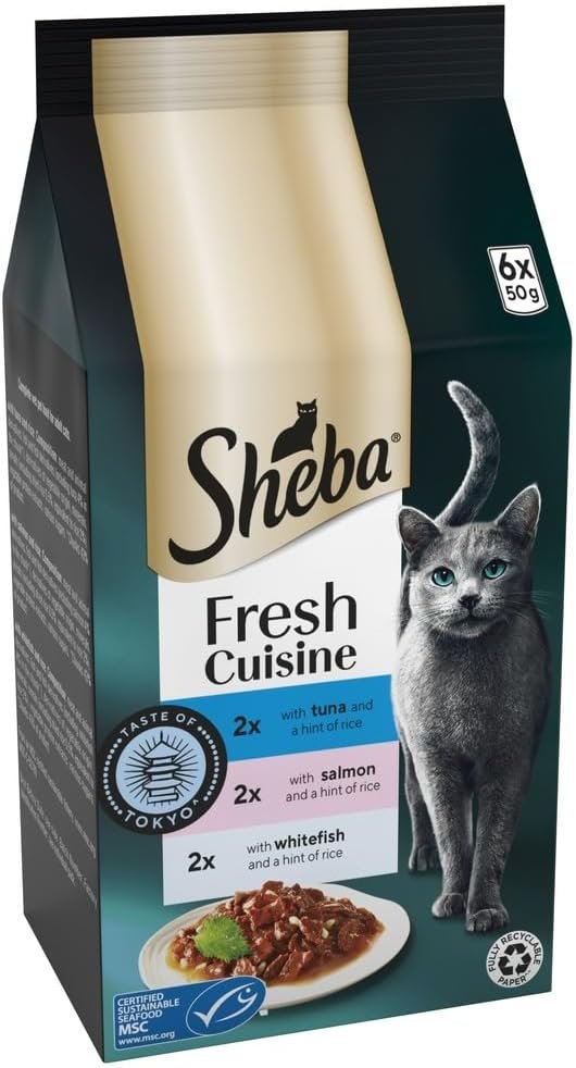 With the SHEBA Fresh & Fine cat food range it's easy to give your cat the tastes they love with a fine combination of delicate pieces providing complete nutrition for your feline companion. Made from select ingredients with no artificial colours or preservatives, a wonderful way to bring you and your feline friend closer at mealtimes. Available in 50g cat food pouches. Suitable for all cats over 12 months – adult and senior.